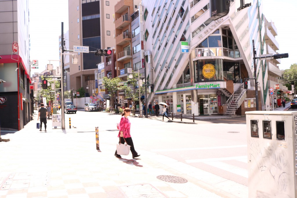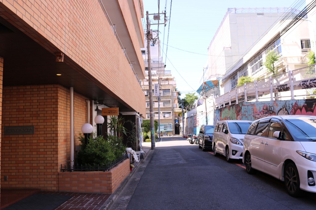 【12】少し直進したら一本目を右折してください。 右折後は坂を下りきり、道路を挟んだ向かいの建物がDANCE WORKSです(唐揚げの京香さんの右隣のNMDビル)