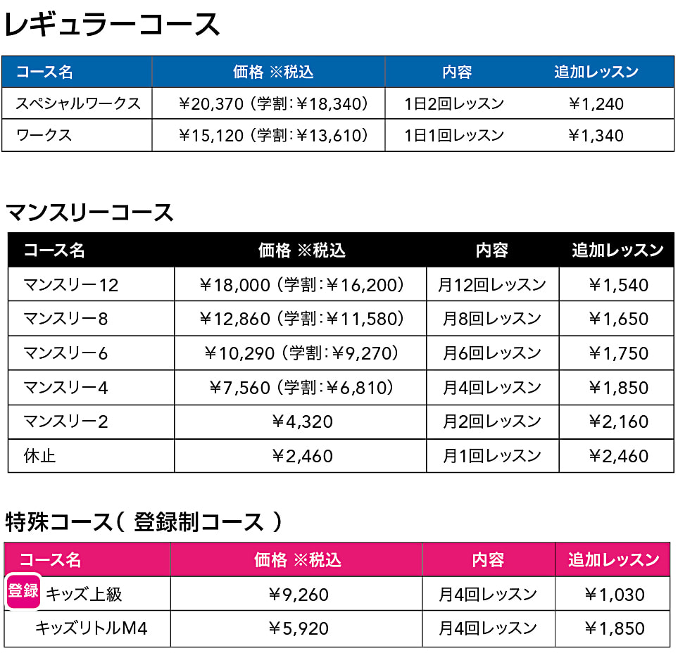※上記対象年齢と異なる設定のクラスもありますので、受講前にご確認をお願いします。