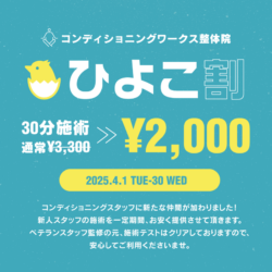 2025.04.01 【NEW STAFF】ひよこ割 30分¥2,000キャンペーン! コンディショニングワークス整体院より 📢キャンペーンのお知らせ!!📢 3月より期間限定でひよこ割キャンペーンを行なっておりましたが ご好評につき延長することが決定致しました!! ...もっと読む コンディショニングワークス整体院