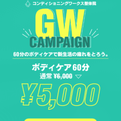 2025.04.21 【𝘾𝘼𝙈𝙋𝘼𝙄𝙂𝙉】¥6,000▶︎¥5,000 ~60分ボディケアで新生活の疲れをとろう~ 《 𝗚𝗪 𝗖𝗔𝗠𝗣𝗔𝗜𝗚𝗡 》 ボディケア60分メニューが 4月29日(火)〜5月11日(日) の期間中 通常 ¥6,000 ▶︎ ¥5,000 ‼︎ このお休みの期間中に、一...もっと読む コンディショニングワークス整体院