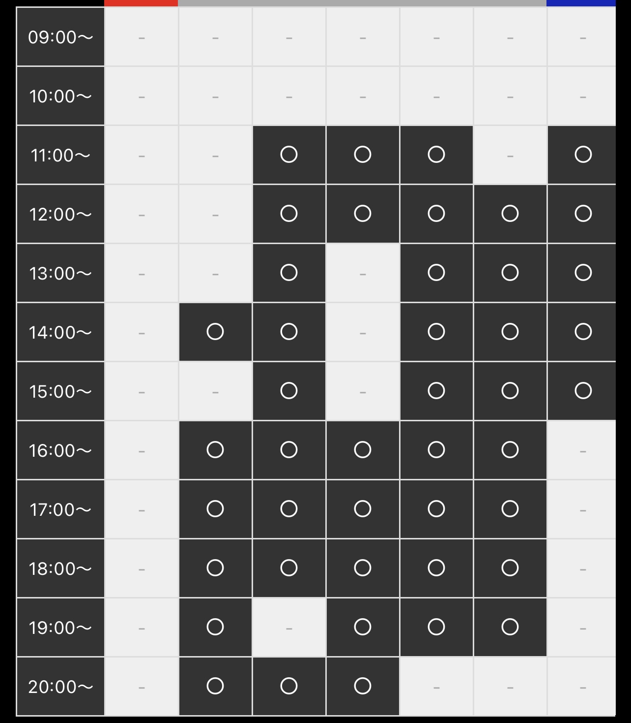 ※こちらでは1時間区切りになってますが○の中に入ると30分ごとの時間表示が出てきます。