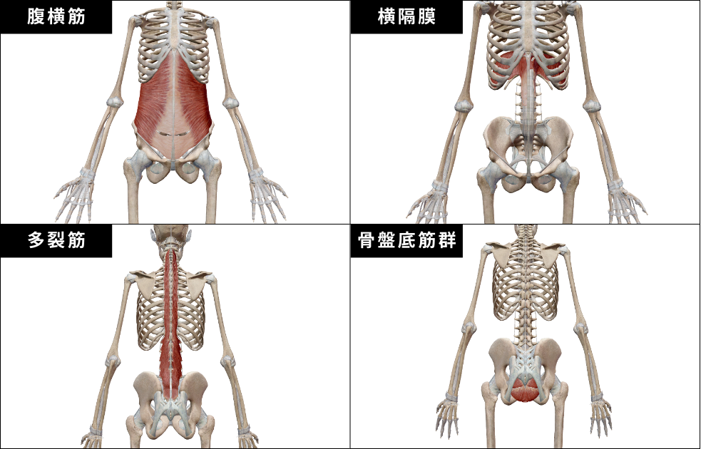 ピラティスやヨガのような、低閾値(低強度)エクササイズは腹横筋・横隔膜・多裂筋・骨盤底筋群といった深層筋群を活性化します。これらは姿勢保持や軸の安定に不可欠な筋群です。